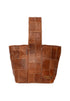 Le cuir récupéré est découpé en petits carrés puis soigneusement assemblé, créant un sac à projet unique et élégant — aucun modèle n’est identique.